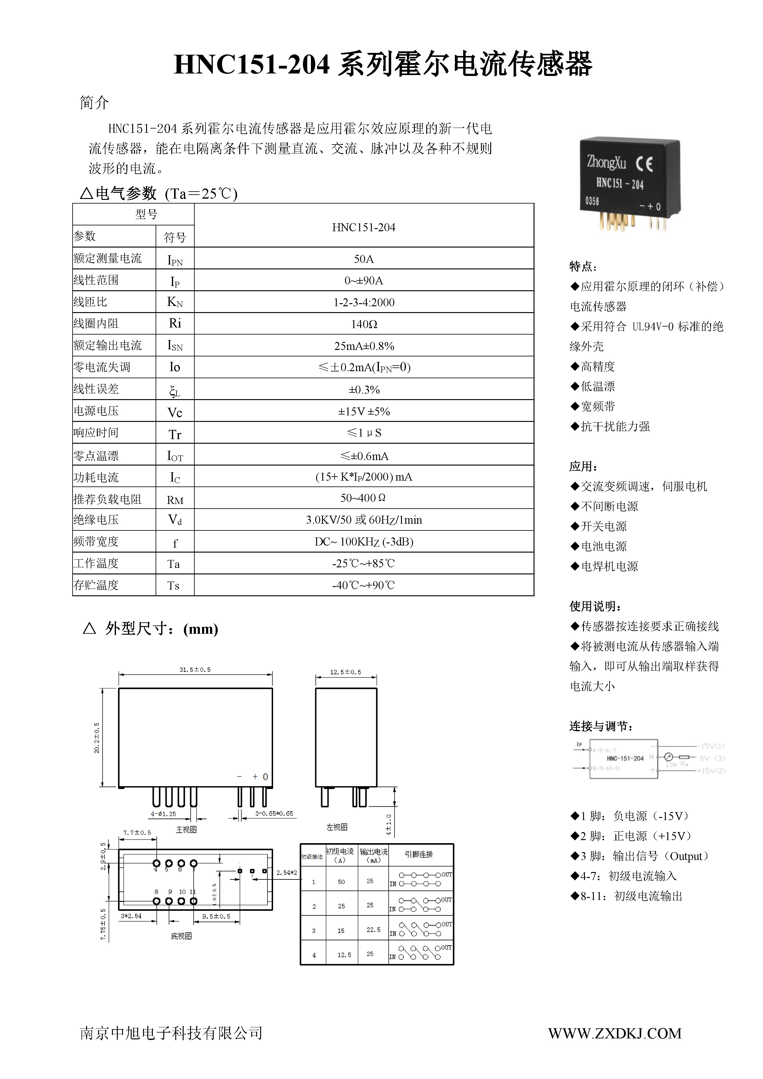 HNC151-204 series Hall current sensor is a new generation of current sensor using the principle of Hall effect. It can measure currents of DC, AC, pulse and various irregular waveform under electrical isolation.